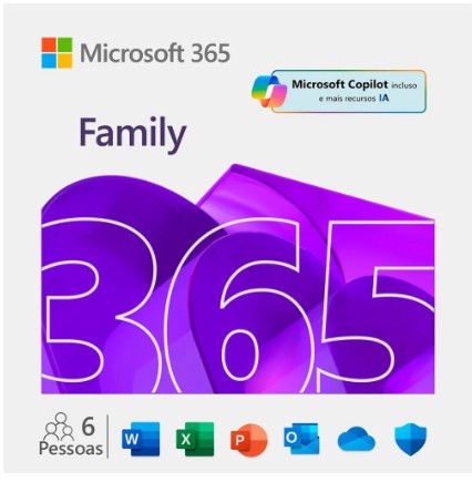 Ideal para famílias ou grupos de até 6 pessoas, o Microsoft 365 Family oferece acesso completo aos aplicativos premium do Office — Word, Excel, PowerPoint, Outlook e muito mais — em até 5 dispositivos por pessoa, incluindo PCs, Macs, tablets e smartphones. Além disso, cada usuário conta com 1 TB de armazenamento em nuvem no OneDrive, garantindo segurança e acesso aos arquivos em qualquer lugar.